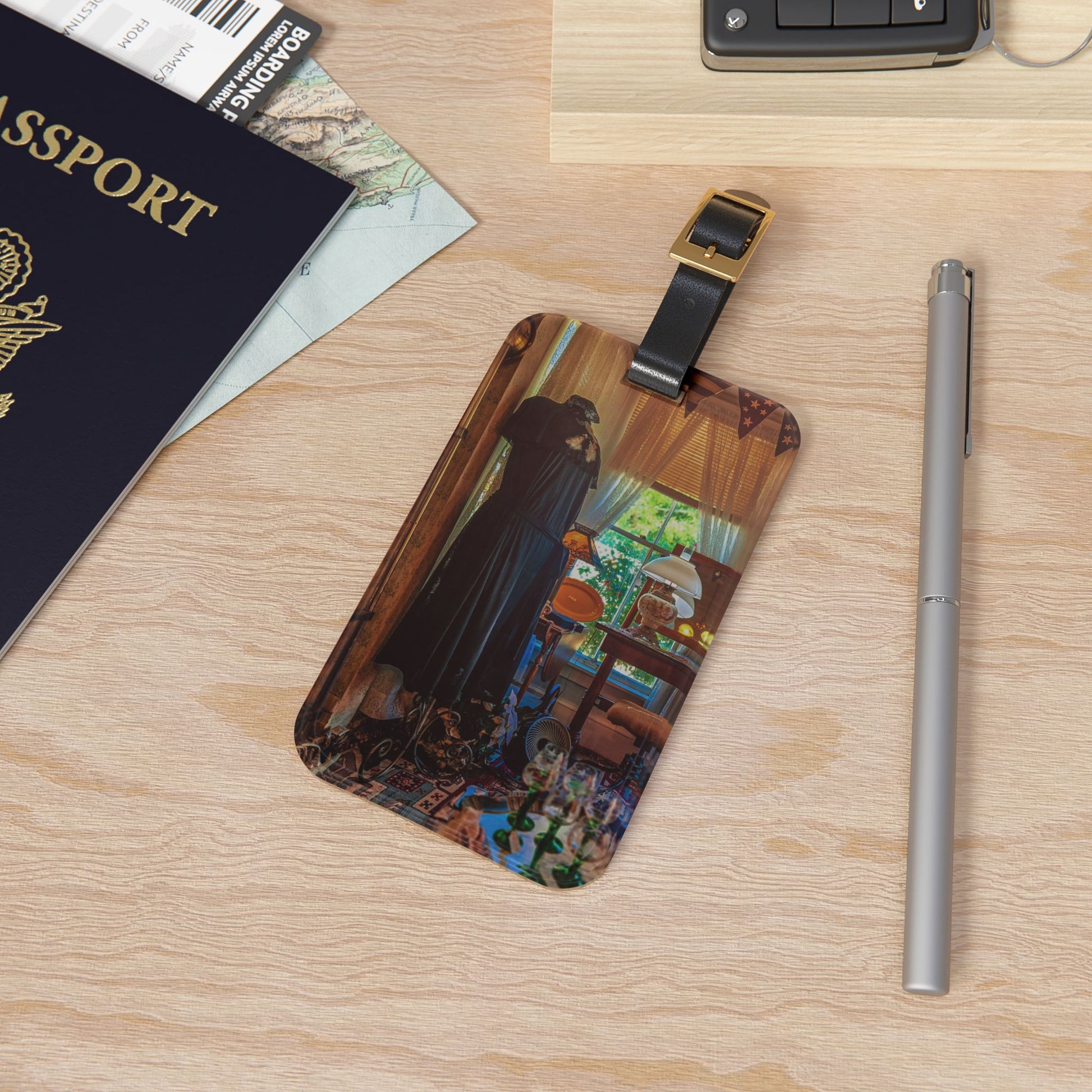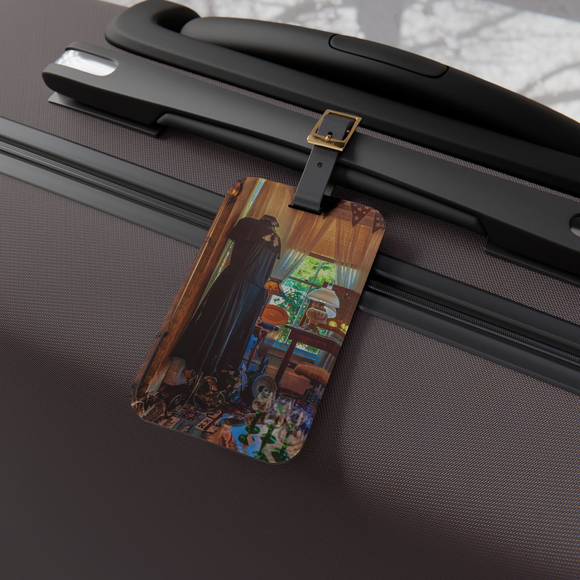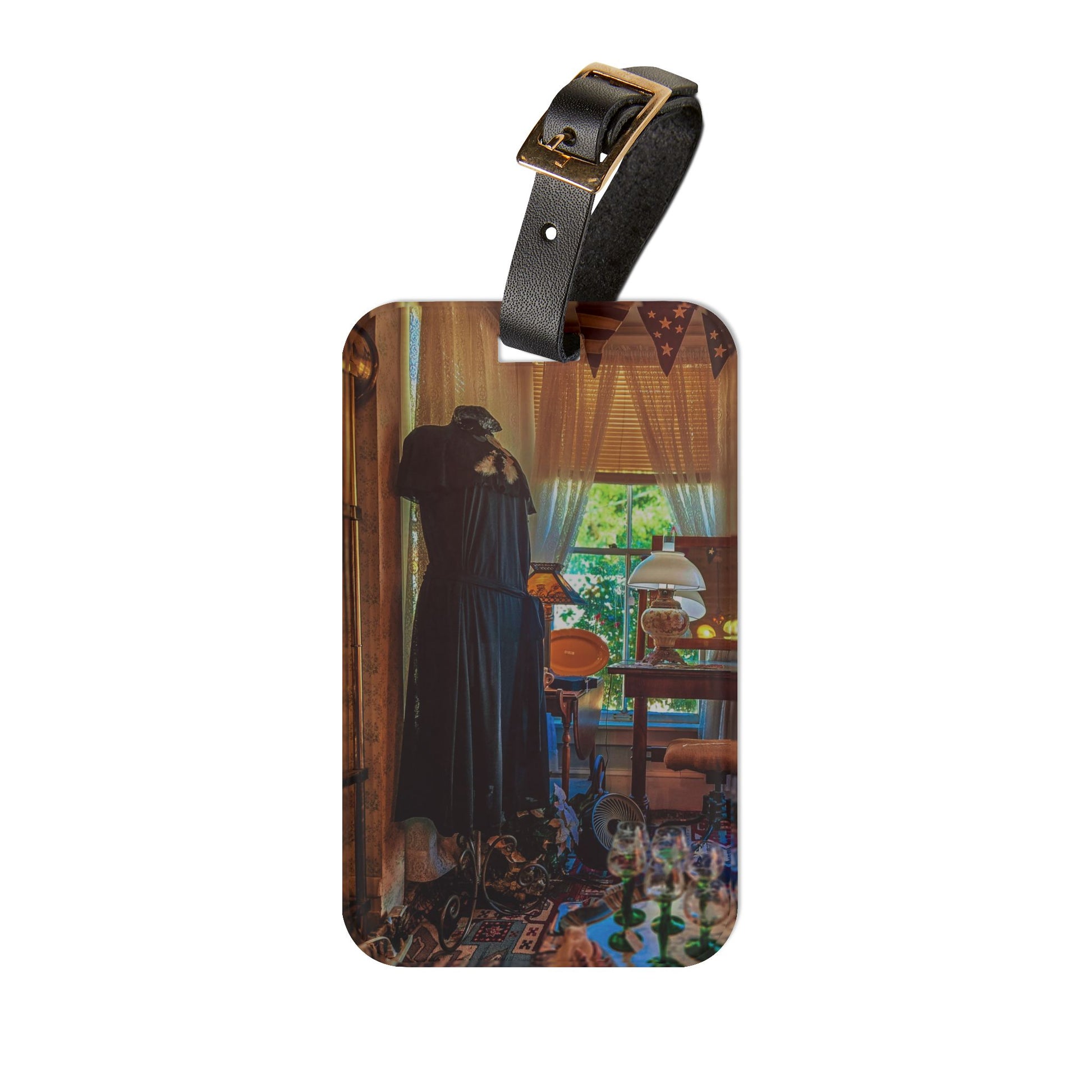 This luggage tag brings the same charm and warmth as your favorite vintage shop find. Featuring a richly colored photograph of a cozy interior inside a well-loved vintage store—a dress form standing near the window, sunlight filtering through, and layers of texture throughout—it adds a quiet sense of story to your travels. Crafted from durable, glossy acrylic, it’s designed to stand up to handling without losing its beauty. The adjustable black leather strap attaches easily, while a discreet back slot keeps your information tucked away. Small but distinctive, it’s a lovely finishing touch for any journey.