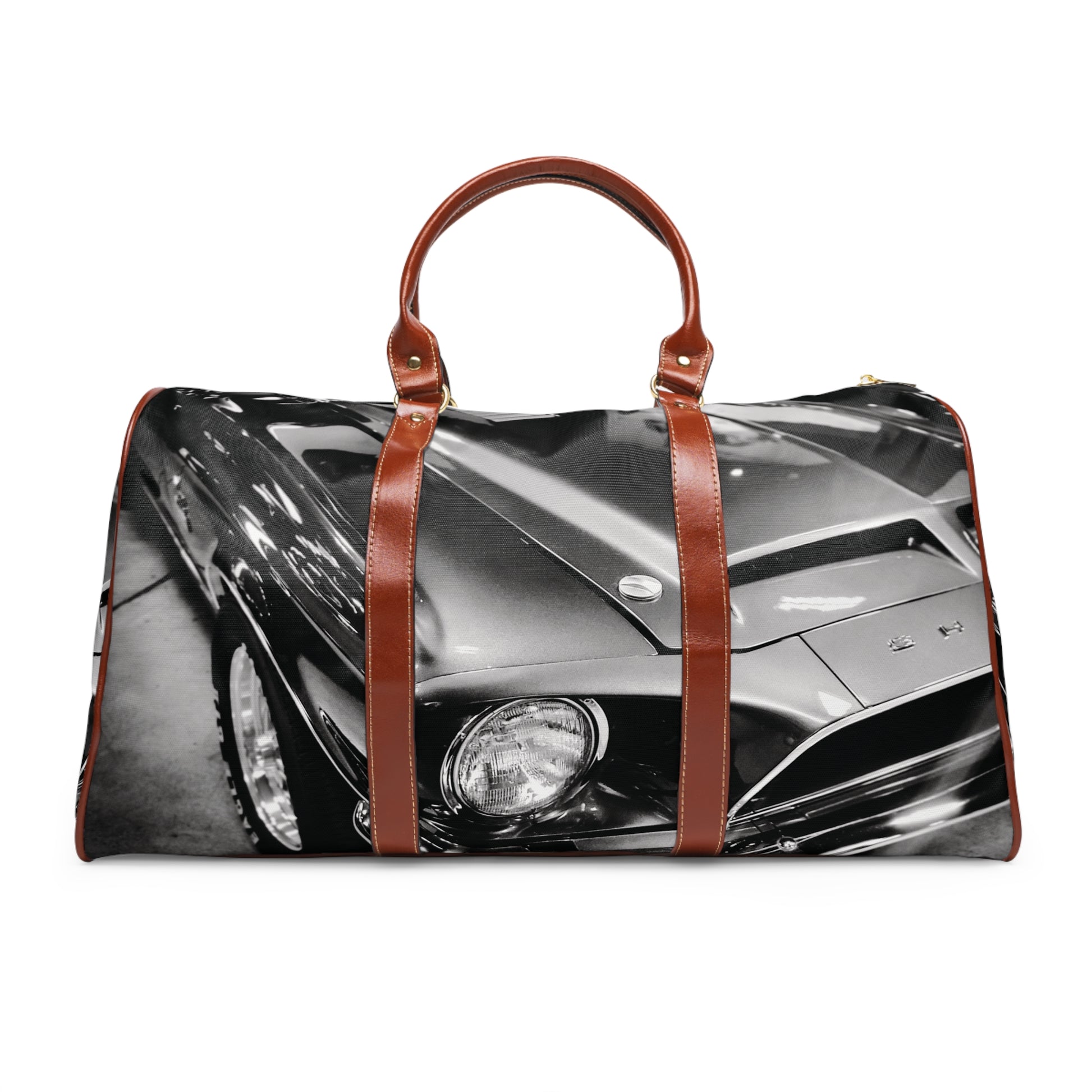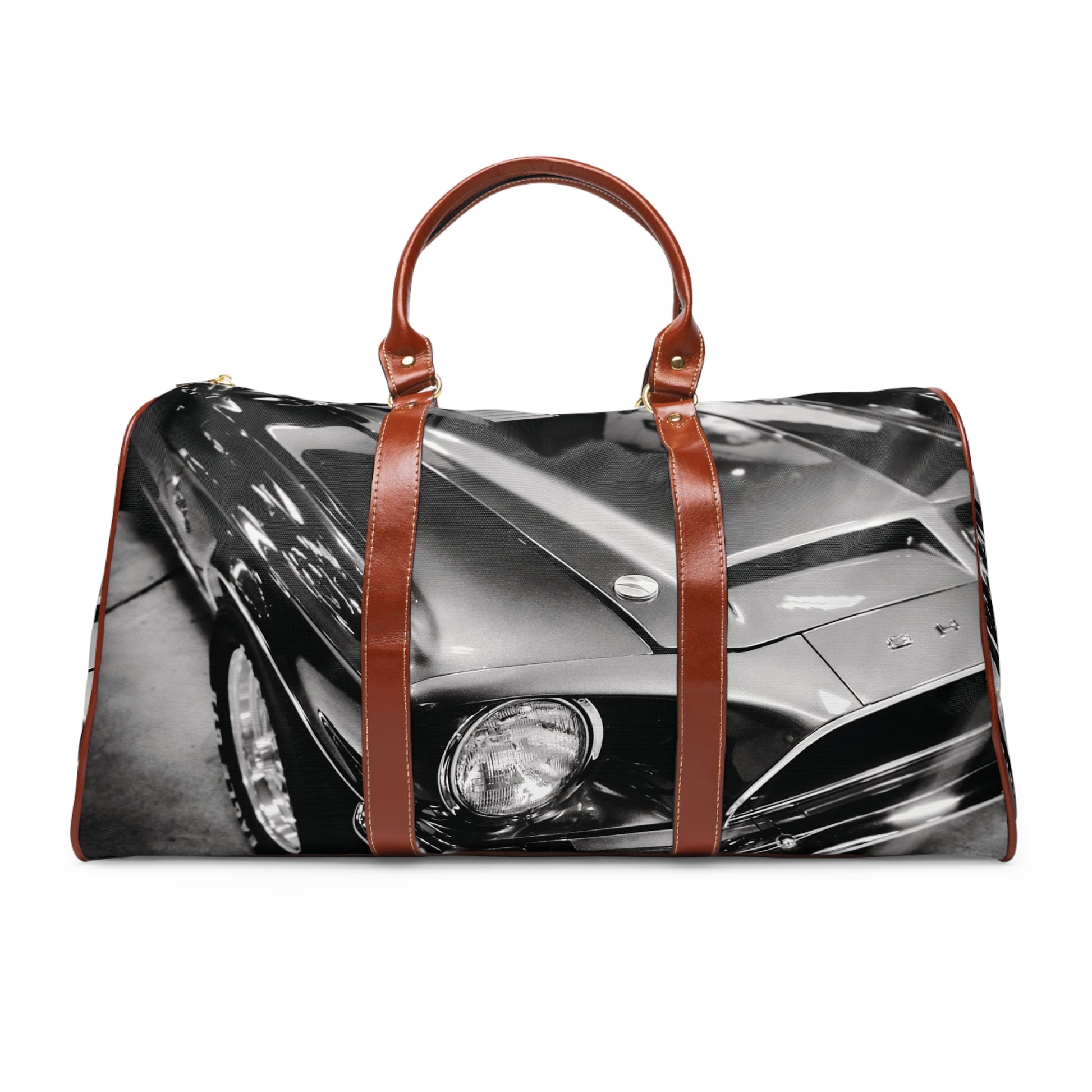 This weekender bag knows the sound of an engine settling into a long stretch of highway. Wrapped in a striking black-and-white photograph of a vintage Mustang, it carries the quiet confidence of classic muscle and miles well traveled. Warm brown PU leather handles and subtle gold hardware add just enough polish—never flashy, always right. It’s roomy enough for a weekend escape, light enough to grab when the road calls unexpectedly. Inside, a clean polyester lining and open pocket keep the essentials in check. The waterproof nylon exterior takes on rain, grit, and whatever the journey throws your way. This is the kind of bag that belongs in the passenger seat—ready when you are.