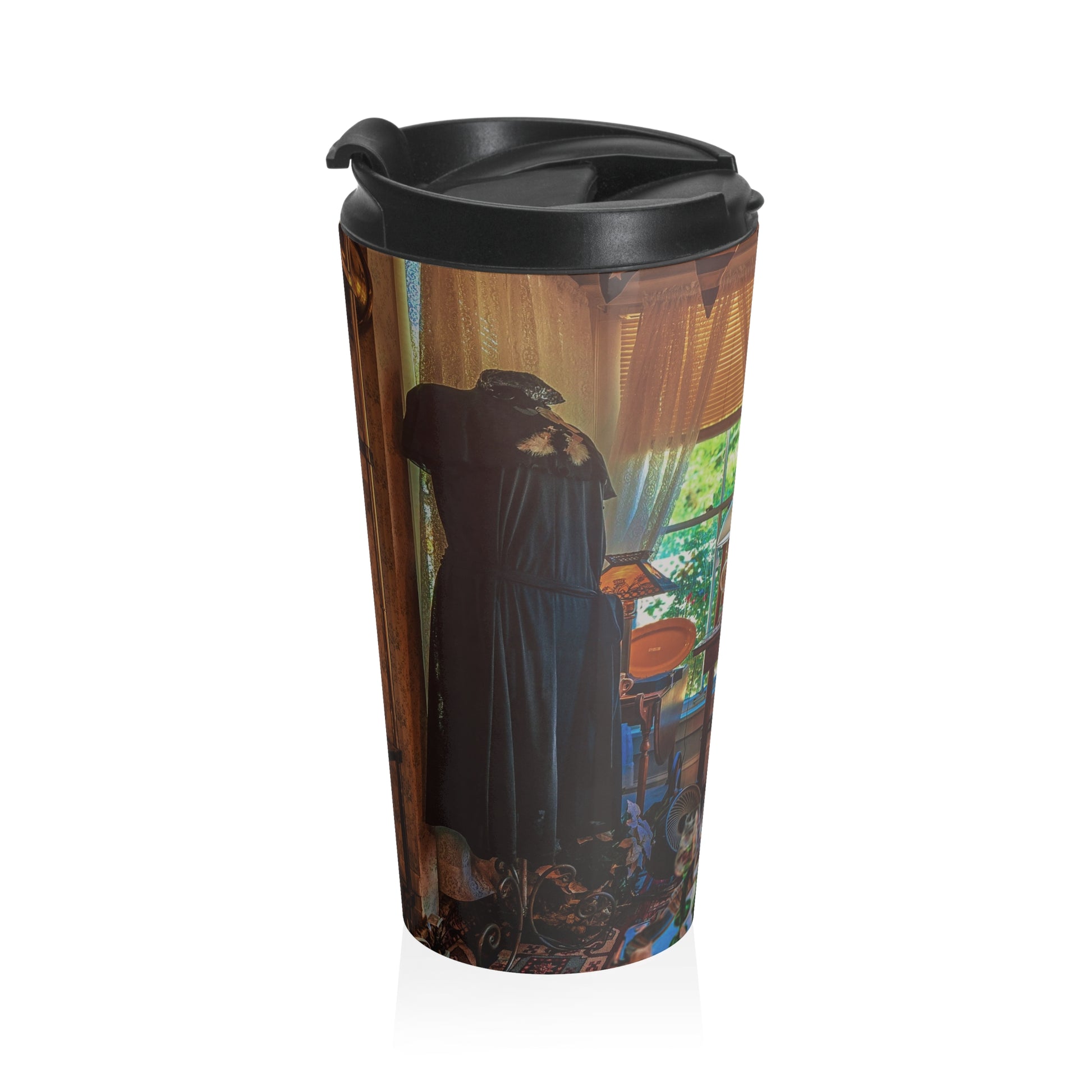 This travel mug turns everyday sips into a small ritual. Featuring a richly detailed photograph from a cozy vintage store space, it brings together gentle light, layered furnishings, and the quiet comfort of a well-loved room. The stainless steel construction keeps drinks warm while you move through your day, whether at home, commuting, or traveling. It’s made for those who appreciate slow routines, secondhand finds, and the beauty of interiors that feel lived in and personal.